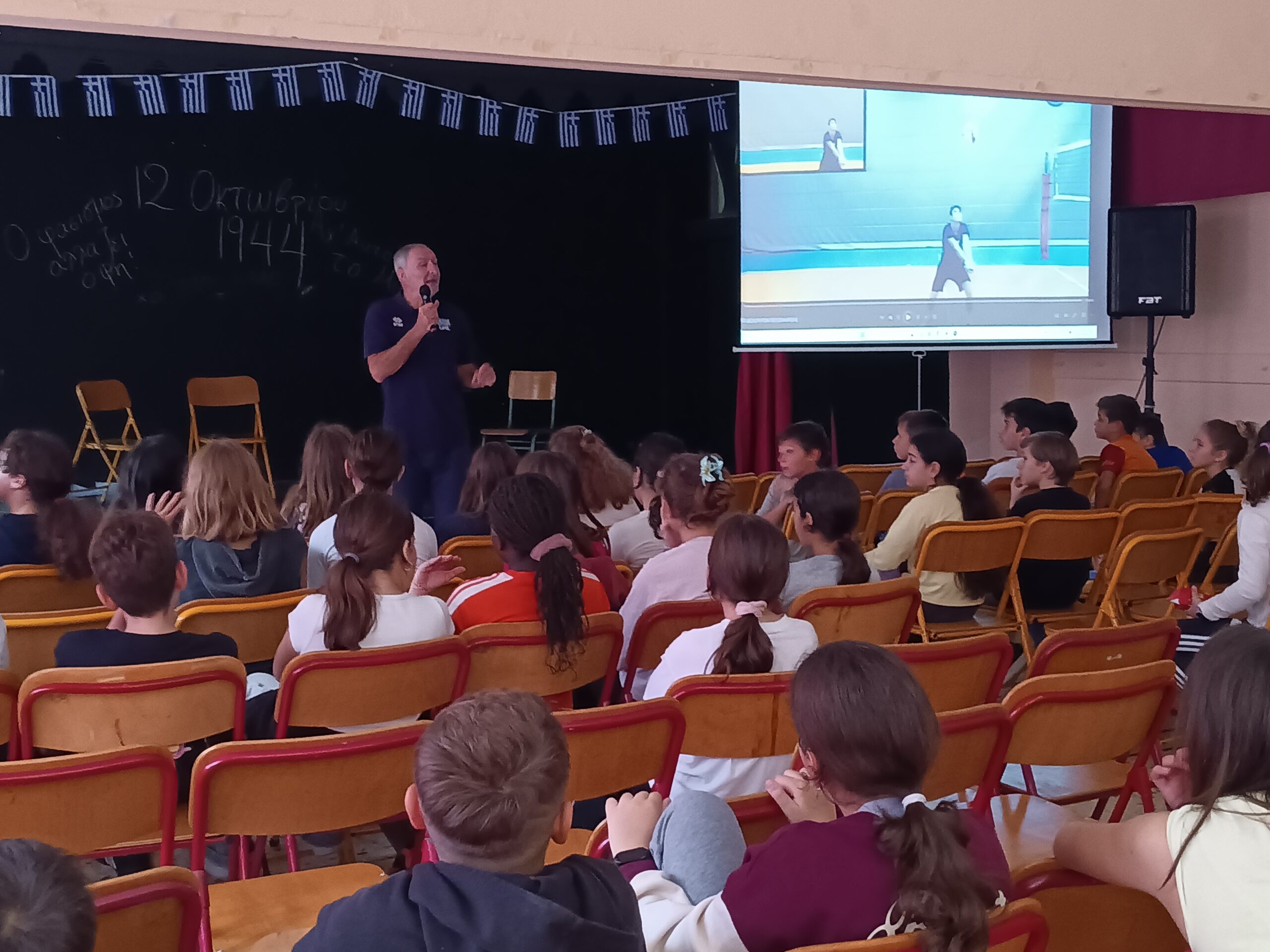 όπου και έκαναν θεωρητική παρουσίαση του αθλήματος με προβολή ειδικών video αλλά και πρακτική εξάσκηση με διδασκαλία των βασικών τεχνικών δεξιοτήτων της πετοσφαίρισης στους μαθητές και τις μαθήτριες των Ε’ και ΣΤ’ τάξεων του σχολείου.