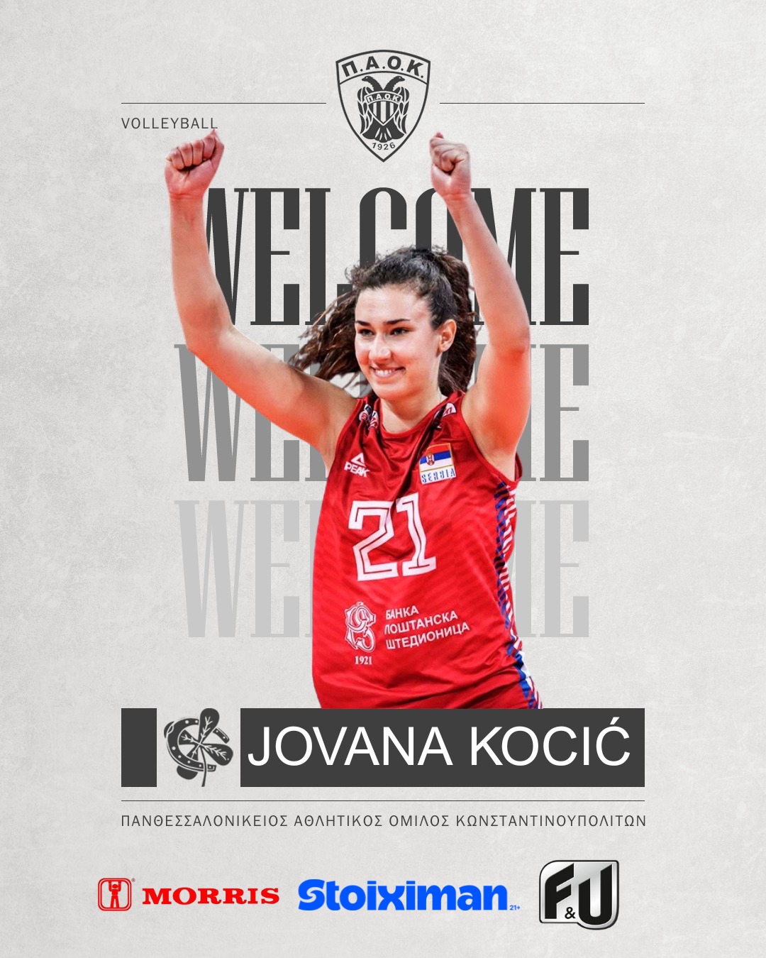 Ο ΠΑΟΚ, και το τμήμα Βόλεϊ γυναικών, ΠΑΟΚ F&U, ανακοινώνουν την έναρξη συνεργασίας με την αθλήτρια, Γιοβάνα Κότσιτς, για την αγωνιστική περίοδο 2025-2026.