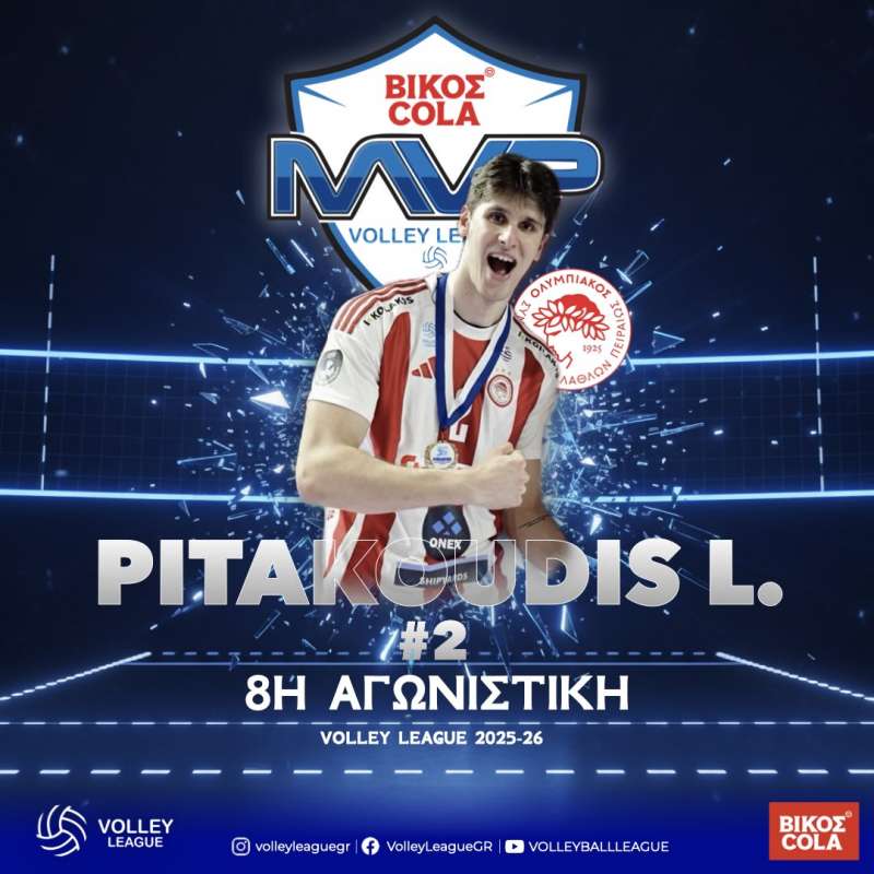 Ο κεντρικός Λάμπρος Πιτακούδης του Ολυμπιακού Σ.Φ.Π. ΟΝΕΧ αναδείχτηκε MVP Βίκος Cola της 8ης αγωνιστικής του πρωταθλήματος Volley League 2025-26.
