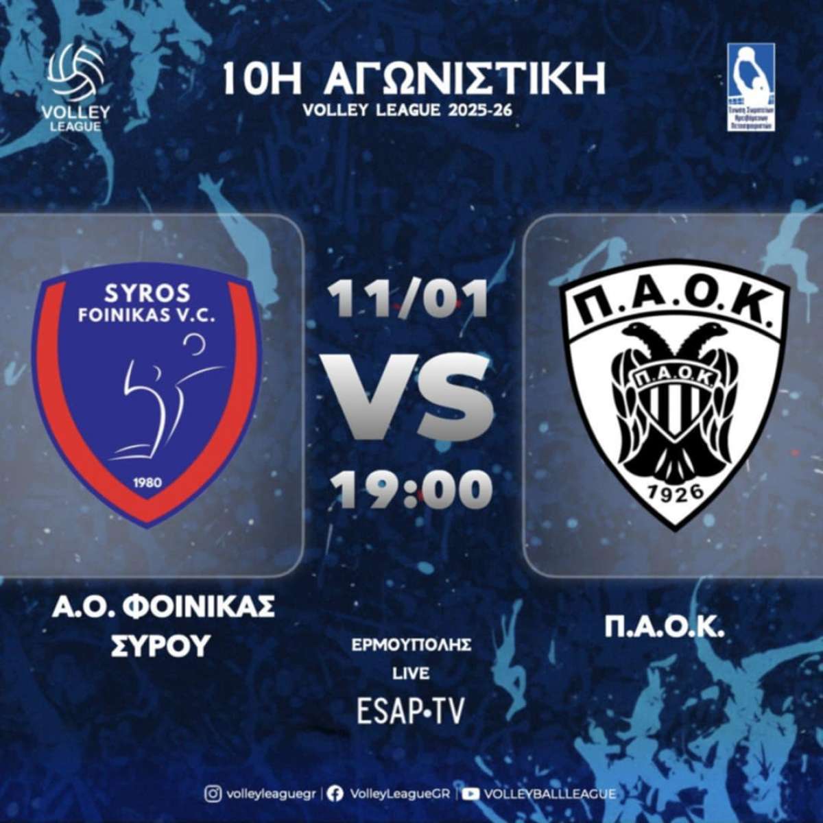 Γυμναστήριο «Δημήτριος Βικέλας» Ερμούπολη, 19.00 (Live Streaming ESAP TV You Tube): Α.Ο. Φοίνικας Σύρου – Π.Α.Ο.Κ.