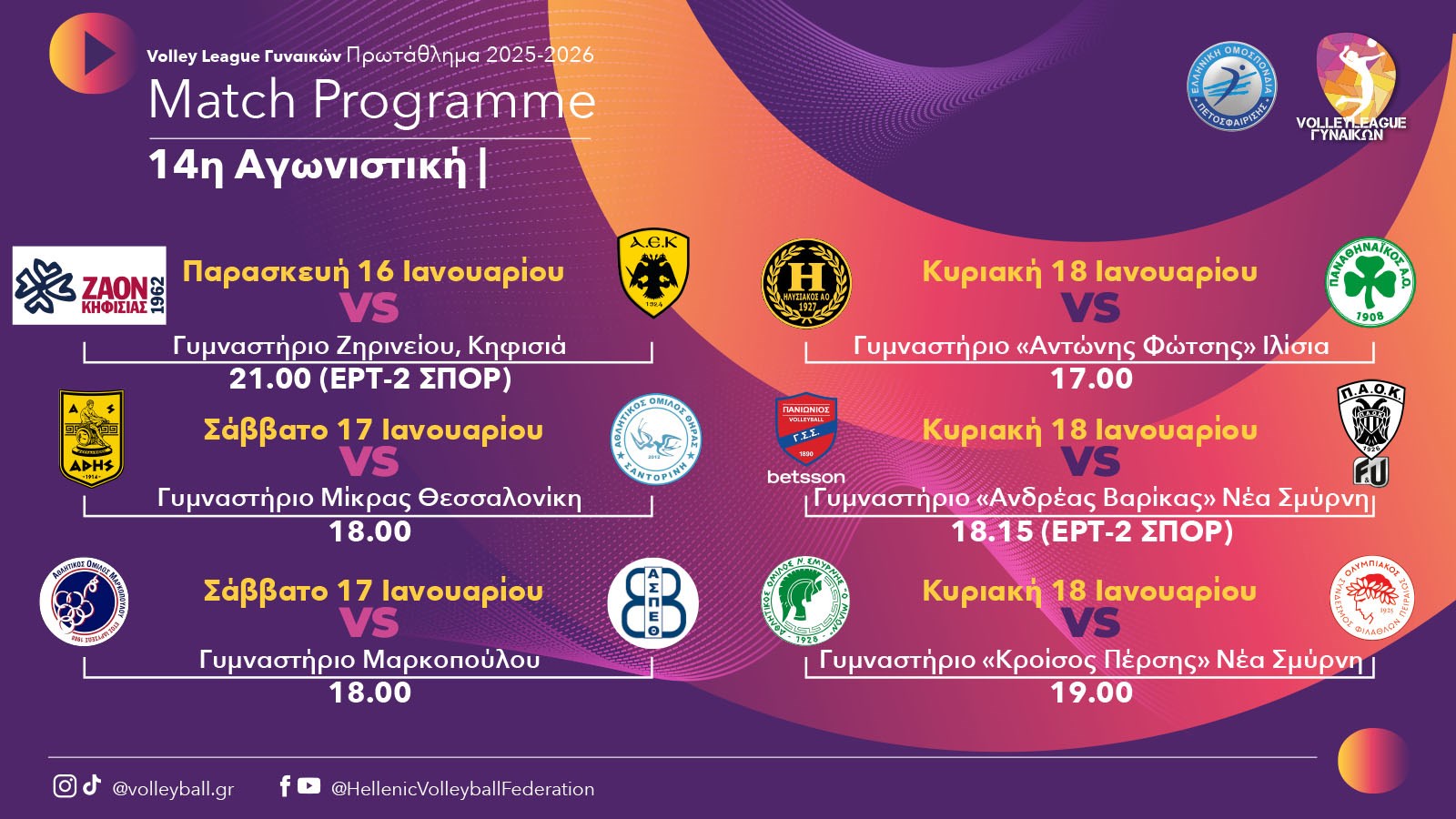 Με την τηλεοπτική αναμέτρηση ανάμεσα στον ΖΑΟΝ και την ΑΕΚ στο κλειστό γυμναστήριο Ζηρινείου ανοίγει το πρόγραμμα της 14ης αγωνιστικής του πρωταθλήματος της Volley League γυναικών, το οποίο θα γίνει σε τρεις δόσεις.