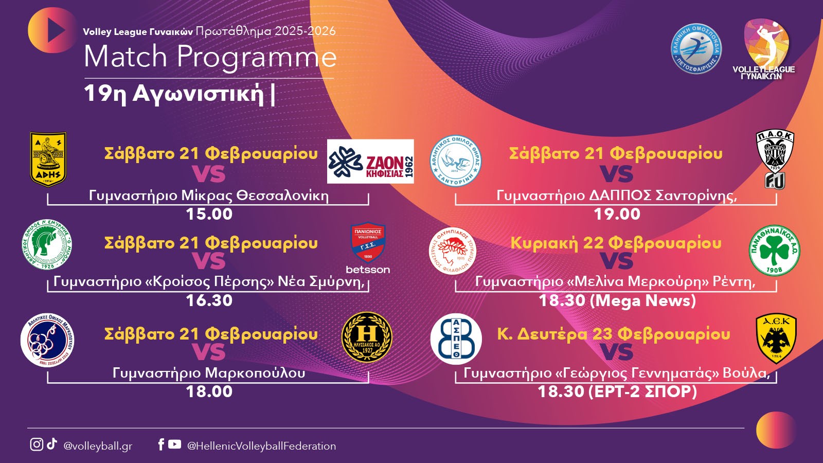 Το πρόγραμμα της 19ης αγωνιστικής κλείνει με την τηλεοπτική αναμέτρηση στη Βούλα ανάμεσα στη Θέτιδα και την ΑΕΚ. Οι δύο ομάδες ισοβαθμούν στην 7η θέση με 25 βαθμούς, με την Ένωση να υπερτερεί στην μεταξύ τους ισοβαθμία λόγω καλύτερο συντελεστή σετ. Ο νικητής θα κάνει ένα βήμα προς την διεκδίκηση μίας καλύτερης θέσης τρεις αγωνιστικές πριν την ολοκλήρωση της κανονικής περιόδου και ο ηττημένος πιθανότατα να καταλάβει την 8η θέση.